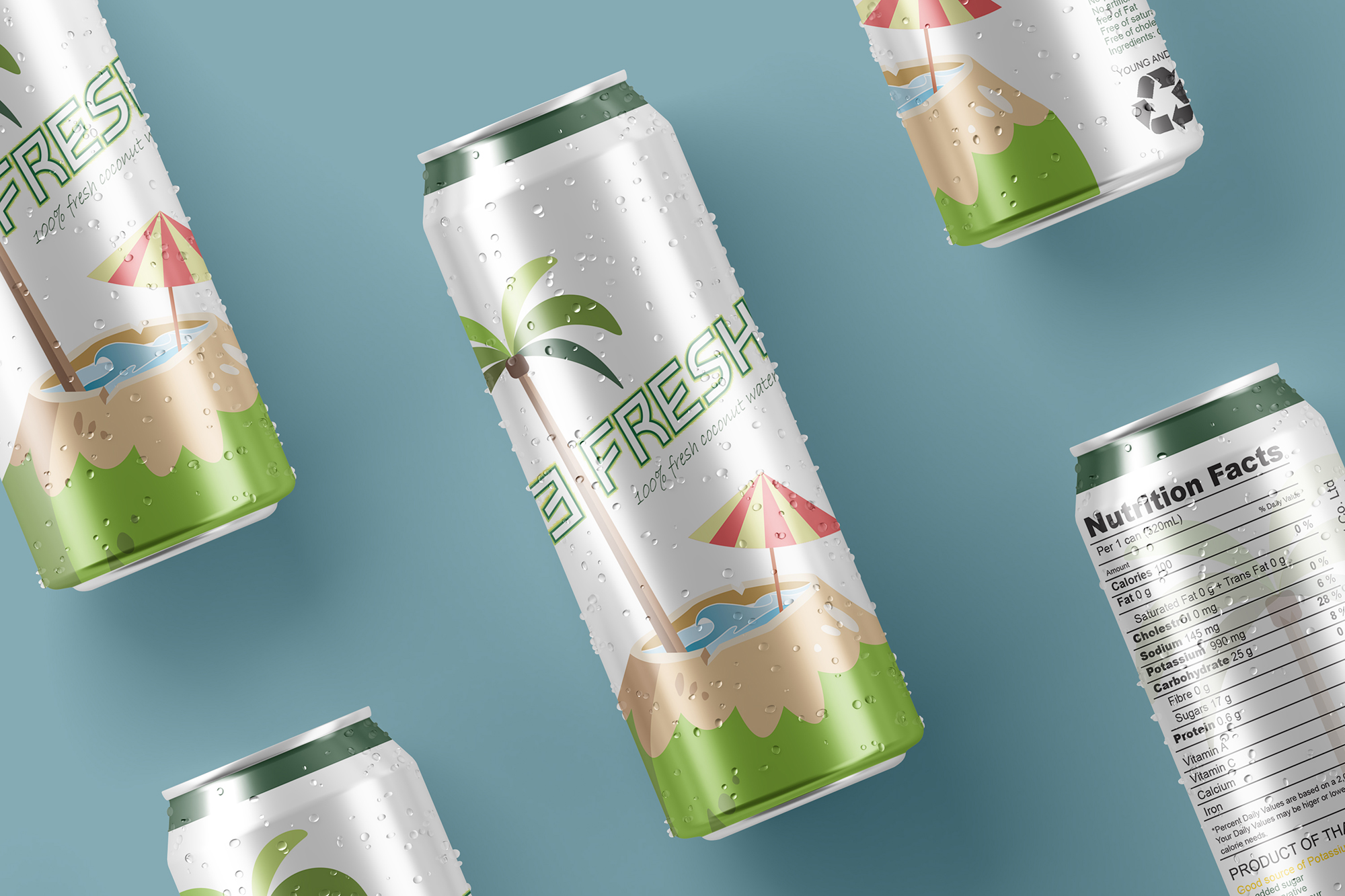 REFRESH is a brand which sells fresh coconut water across America. The packaging for the brand was done in a simplistic style depicting the warm sunnyside of a beach.