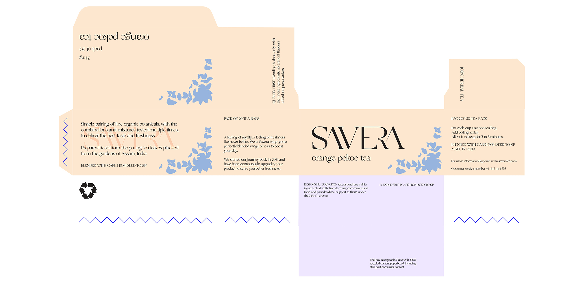 SAVERA means morning in Hindi. The packaging of the tea is minimal and stylistic to the brand. Complementary colors have been used for the different flavors and to establish a contrast in the overall design.